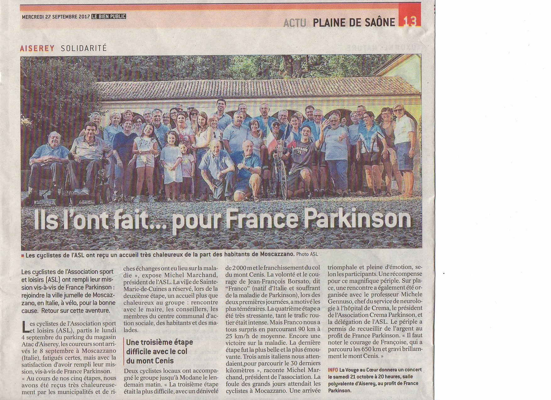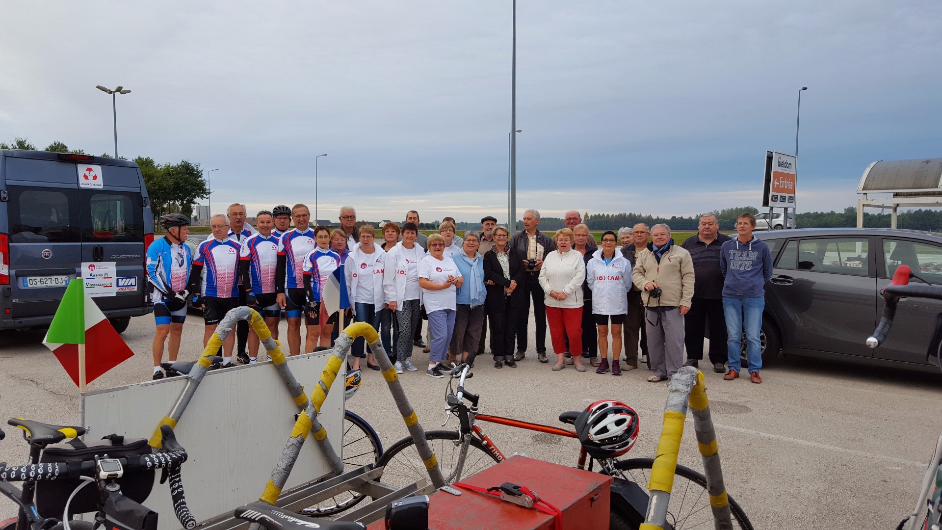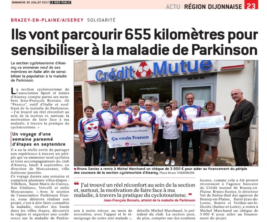 En 2017, un ami atteint de la de Parkinson, faisant partie de notre association, a tenu à réaliser un projet, rejoindre Aiserey à Moscazzano en vélo.