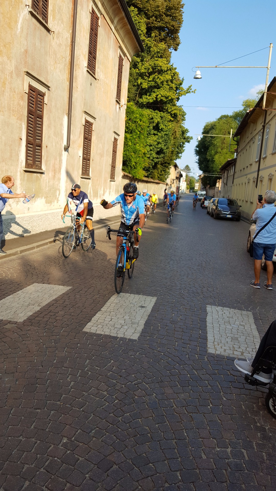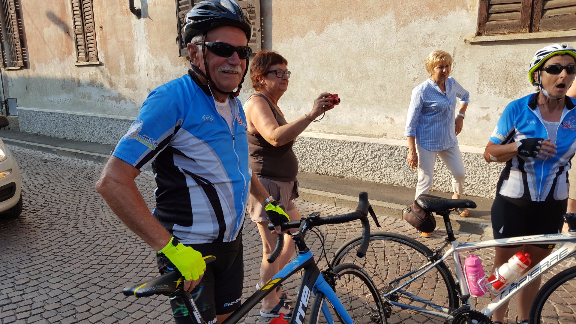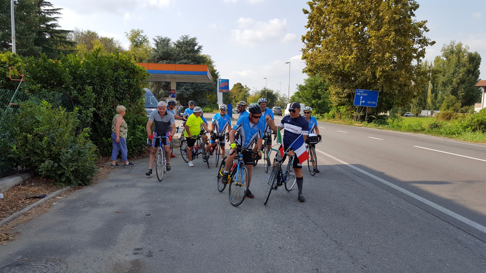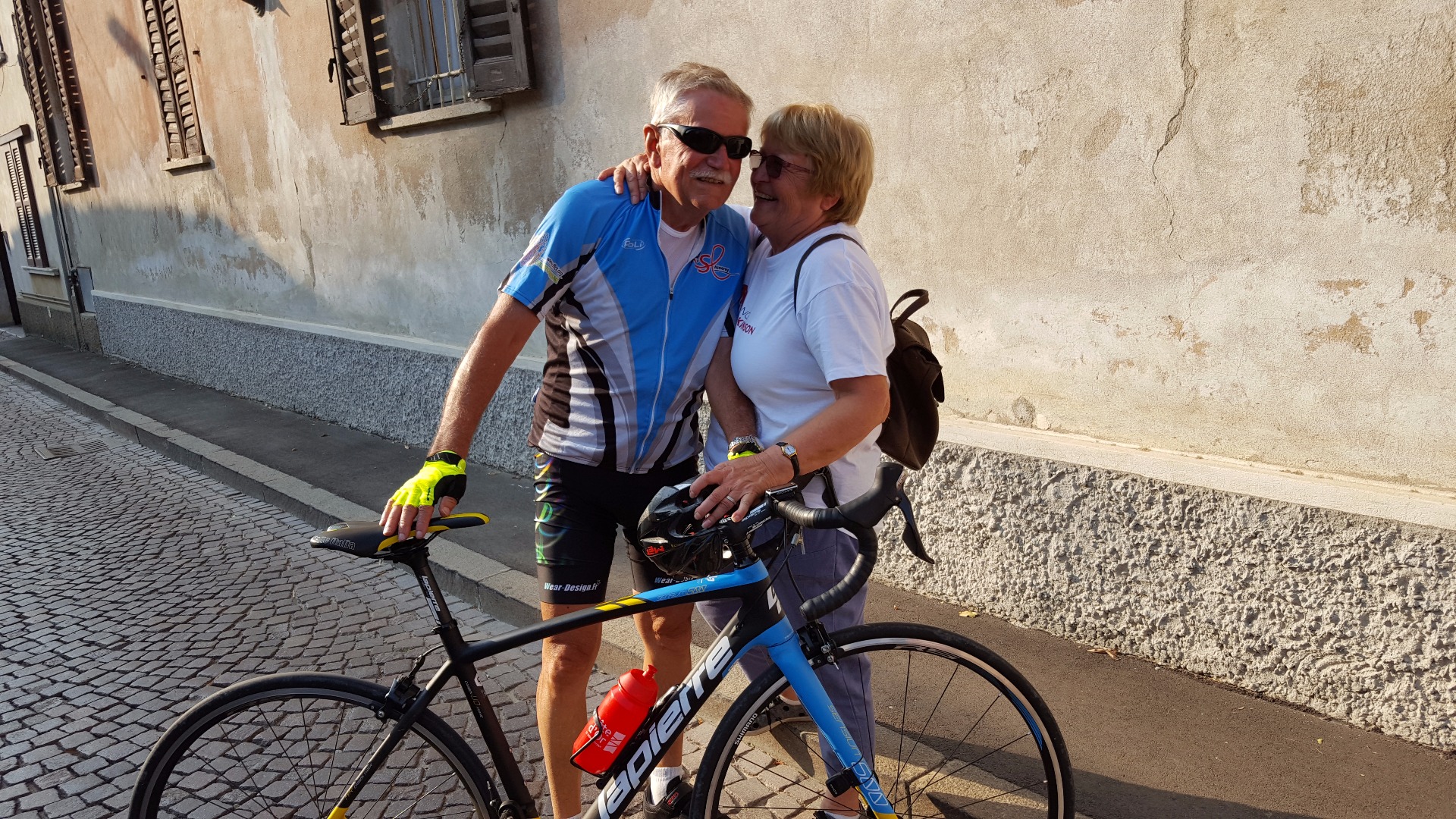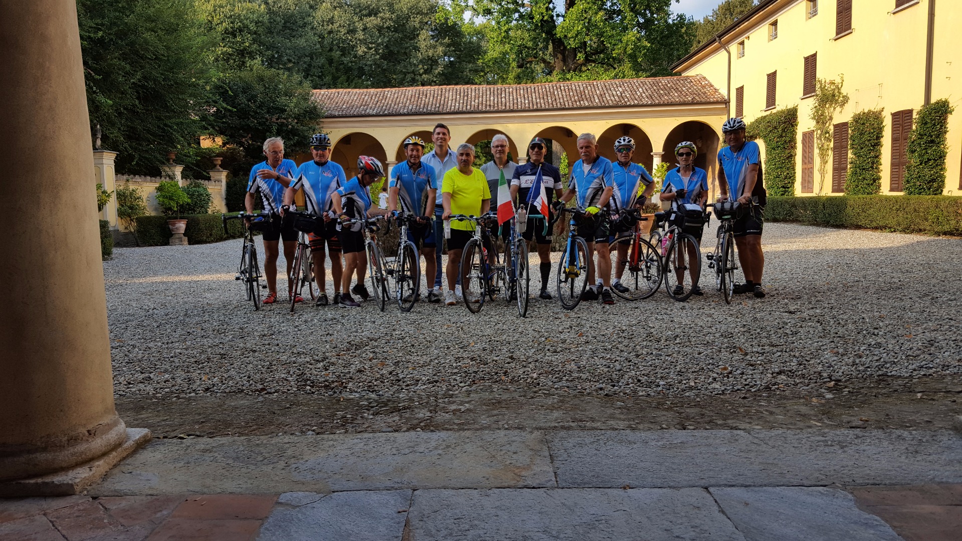 Nous retrouvons nos amis cyclos de Moscazzano qui nous accompagnent sur les 50 derniers kilomètres. Remarquez la décoration du vélo de Pietro.
