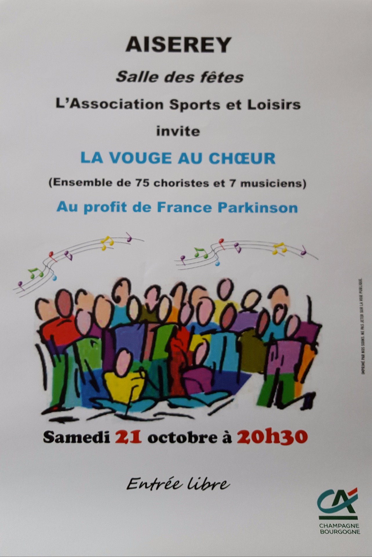 La collecte pour France-Parkinson va continuer, l'ASL invite 75 choristes et 7 musiciens de LA VOUGE AU CHŒUR pour un concert à AISEREY le 21 octobre à 20h30.